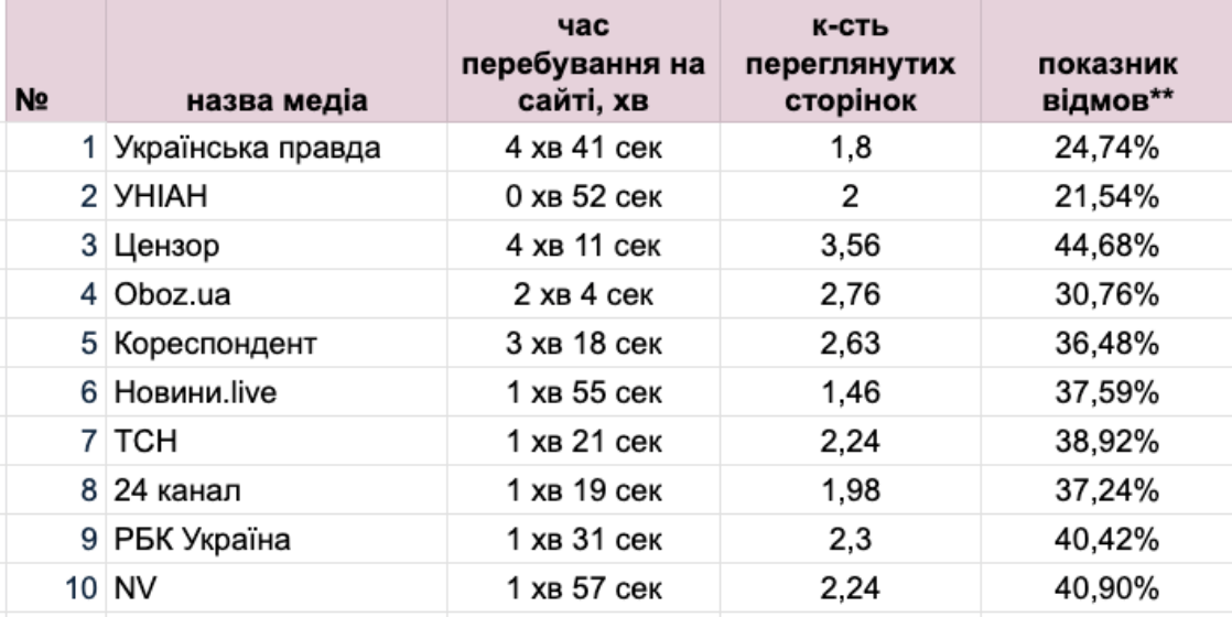 Експерти Інституту масової інформації також проаналізували такі ключові параметри в 10 найпопулярніших медіа: час перебування відвідувачів на сайті, кількість переглянутих сторінок та показник відмов (позначає відсоткове співвідношення кількості відвідувачів, що залишили сайт прямо зі сторінки входу або переглянули не більш ніж одну сторінку сайту).