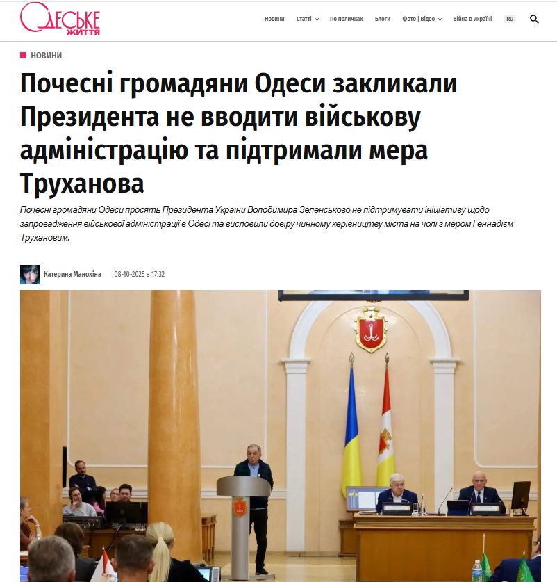 Новина про підтримку міського голови Труханова мала ознаки політичної замовності. Скрін: “Одеське життя”