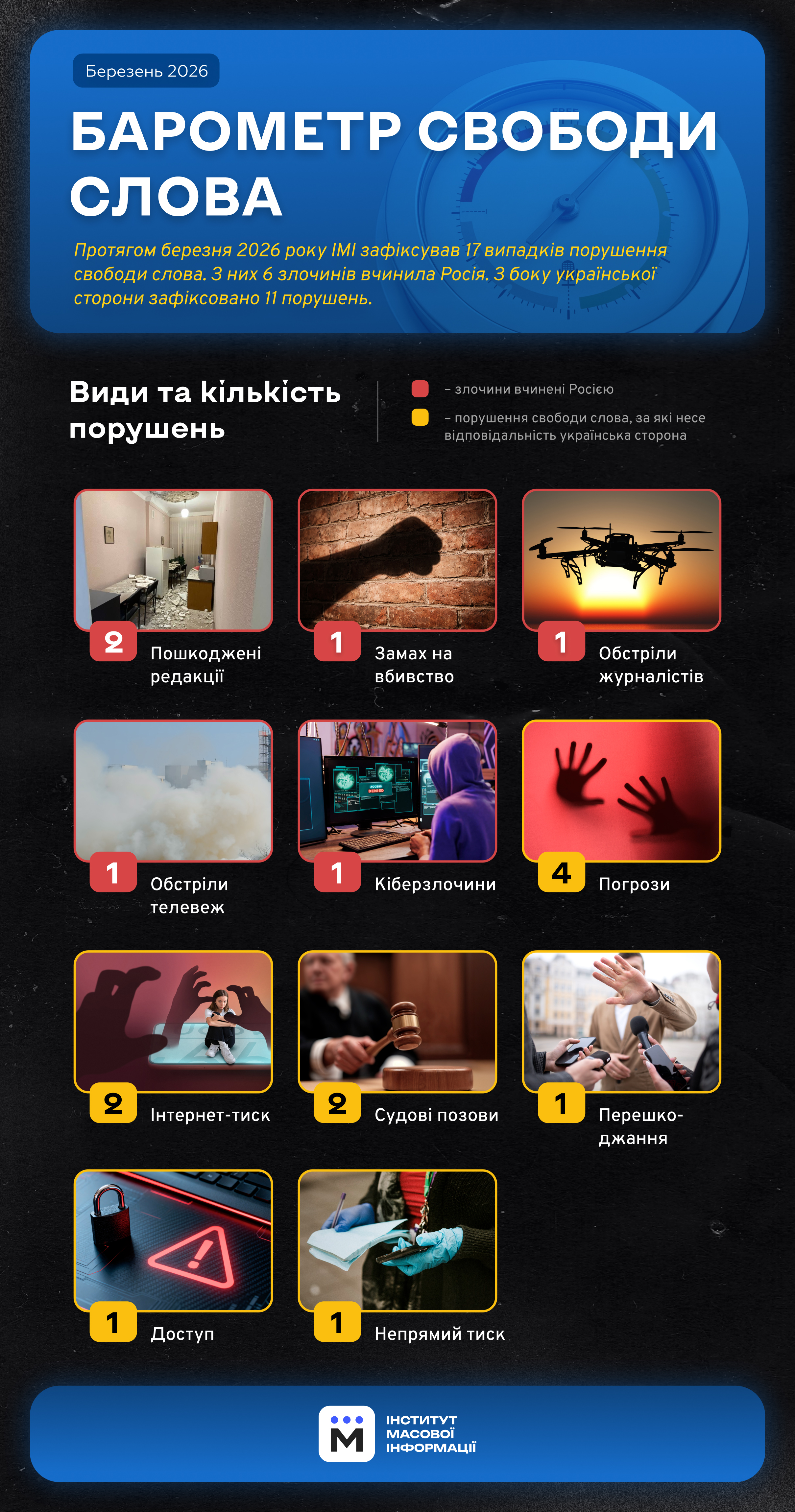 У березні 2026 року експерти Інституту масової інформації зафіксували 17 випадків порушення свободи слова в Україні. З них шість вчинила Росія. Такими є дані щомісячного моніторингу ІМІ “Барометр свободи слова”.