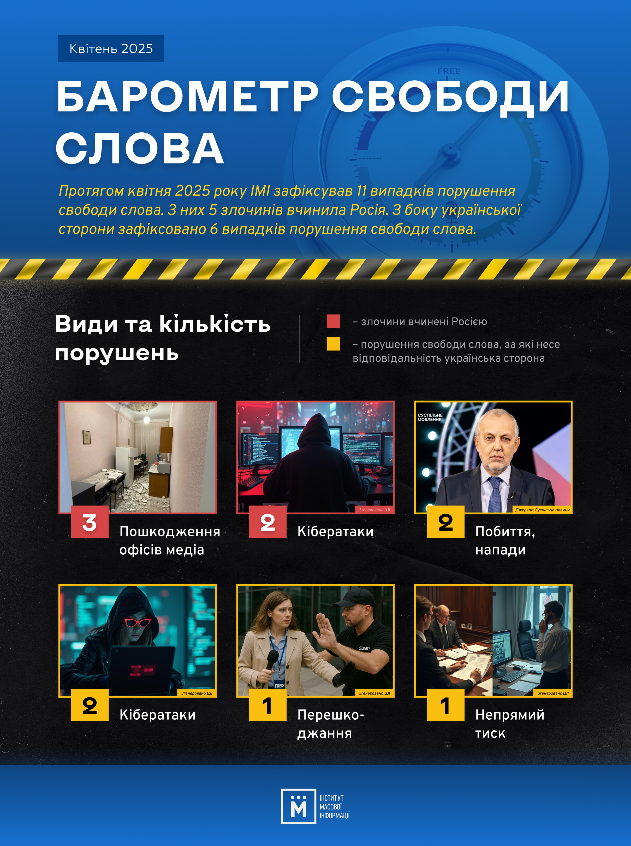 За квітень ІМІ зафіксував п’ять злочинів проти медіа та журналістів, які скоїла Росія. Це випадки пошкоджень редакцій медіа та кібератак.