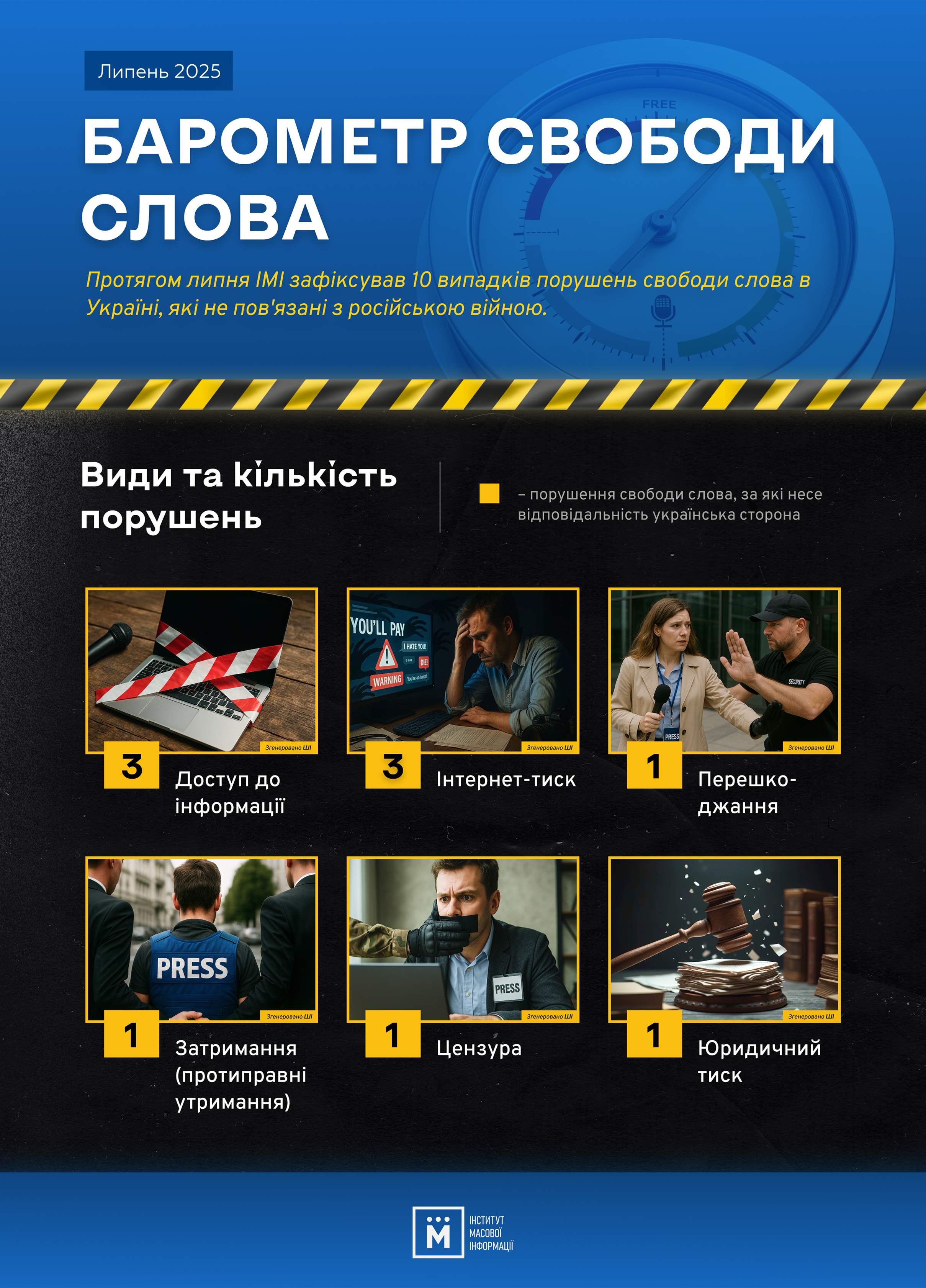 У липні експерти Інституту масової інформації зафіксували 10 випадків порушення свободи слова в Україні. Усі ці інциденти не були пов’язані з війною Росії проти України: їх вчинили саме українські громадяни.