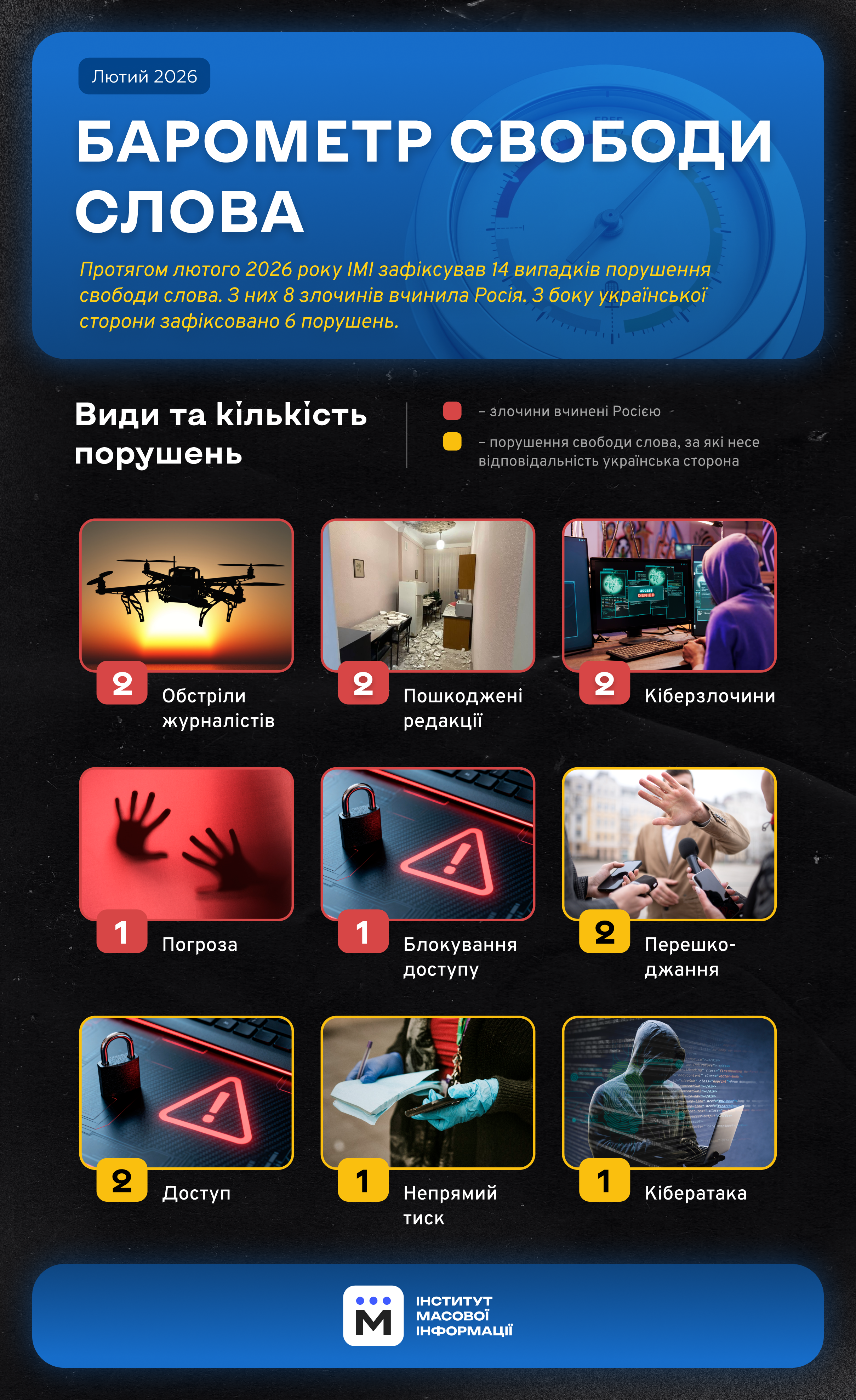 У лютому 2026 року експерти Інституту масової інформації зафіксували 14 випадків порушення свободи слова в Україні. З них вісім вчинила Росія. Такими є дані щомісячного моніторингу ІМІ “Барометр свободи слова”.