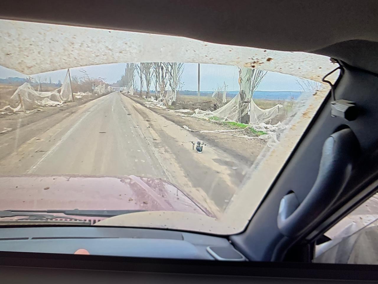 Той самий дрон (його не видно на фото) намагається наздогнати машину. Згодом він сів в очікуванні більш релевантної цілі. Фото: В’ячеслав Ратинський