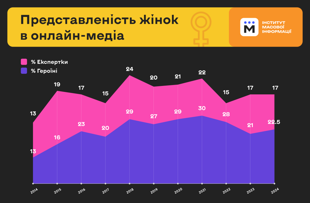 Дані та інфографіка Інституту масової інформації щодо представленості жінок в українських онлайн-медіа 2014–2024. Цифри в інфографіці оновлено у зв’язку з уточненням даних.