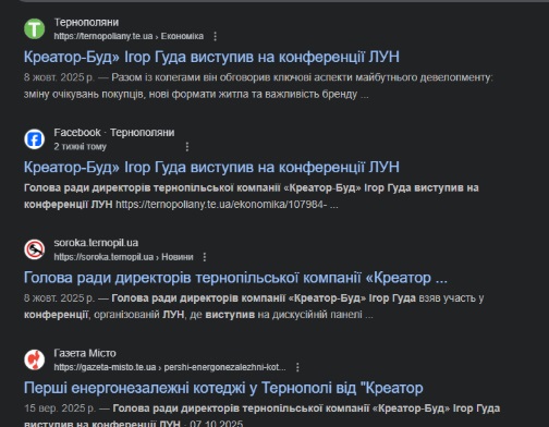 До комерційної джинси ми також зарахували матеріал про те, що голова ради директорів тернопільської компанії “Креатор-Буд” Ігор Гуда виступив на конференції ЛУН. У “Тернополянах” він потрапив до економічної рубрики, ідентичний матеріал опублікували на сайтах “Місто” і “Сорока”.