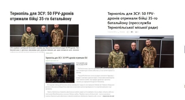 Для прикладу, новину про передані від Тернопільської громади 50 FPV-дронів для бійців 35 батальйону розмістили і 0352.ua (в рубриці “Суспільство”), і “Тернополяни” (в рубриці “Життя”). Водночас у тексті двічі наголошують, що техніку передала міська рада: “Передача техніки від міської ради – частина регулярних ініціатив Тернополя щодо забезпечення підрозділів необхідним обладнанням. Бережіть себе, хлопці!” – підкреслив міський голова Сергій Надал”. Тільки після цього є згадка, що допомогу все ж надає місто з бюджету громади, а не безпосередньо від міської ради.