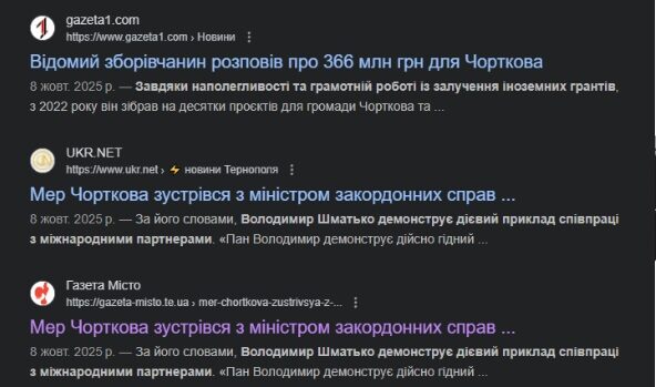 Що ж до інших очільників громад, то під час моніторингу цікавою також була новина “Відомий зборівчанин розповів про 366 млн грн для Чорткова”. Відомим зборівчанином виявився міністр закордонних справ Андрій Сибіга, з фейсбук-допису якого без зазначення джерела на “Першому онлайн” зробили новину про міського голову Чорткова Володимира Шматька. Загугливши компліментарну фразу Сибіги “Пан Володимир демонструє дійсно гідний приклад роботи з партнерами”, можна знайти новини про цю зустріч з акцентом на те, що очільника Чорткова похвалив сам Сибіга, зокрема на сайтах “Місто”, “Ровесник” і TeNews.