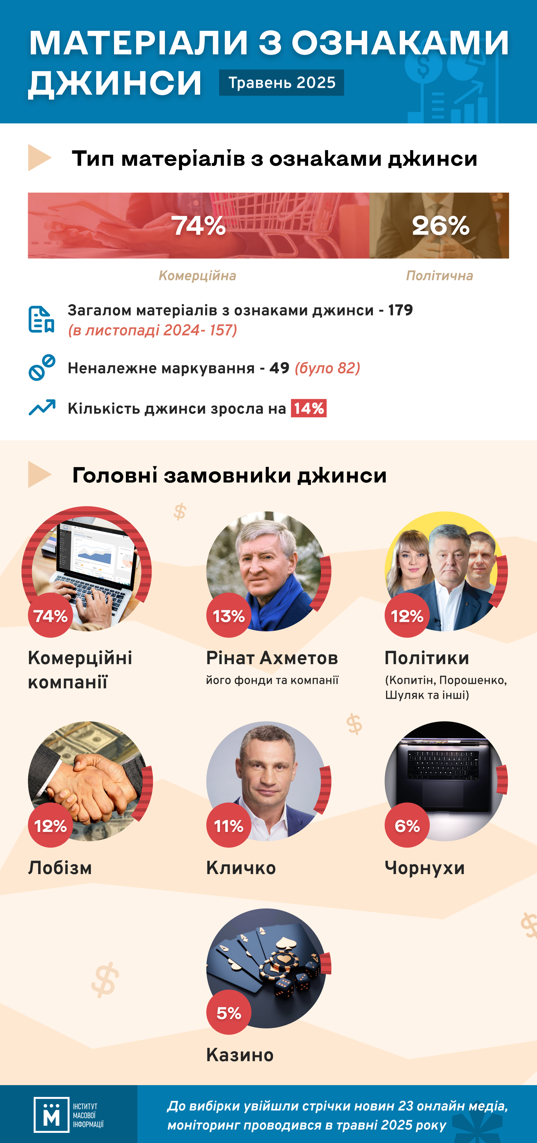 Серед головних замовників джинси стабільно фігурує бізнесмен Рінат Ахметов, чиї благодійні й комерційні ініціативи мають найширшу присутність у цьому сегменті. У травні 2025 року його частка становила 13% усіх матеріалів з ознаками джинси. Це нижче, ніж у листопаді (19%), але однаково дозволяє зберігати перше місце серед комерційних гравців.