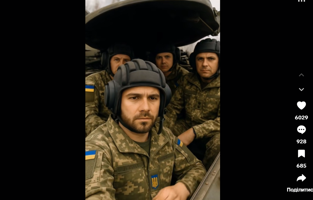1. Маніпуляція. Відео, створене за допомогою штучного інтелекту, демонструє українських військових, які нібито просто позують перед камерою, супроводжуване гаслом “Слава Україні!”. Ролик видається суто засобом для стимулювання реакцій аудиторії, а не інформативним матеріалом і має ознаки навмисної маніпуляції задля збільшення трафіку.