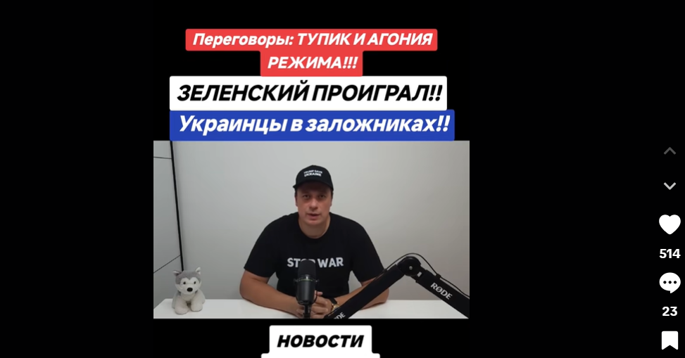 28. Маніпуляція. Блогер Тарас Никифорчук у відео, говорячи російською, обіцяє “розкрити правду” про майбутнє України, однак наводить вибіркові факти, що стосуються переговорного процесу, критикує зовнішній вигляд українських посадовців і виправдовує дії Росії. Він заявляє, що варто “убрать причины войны – вот это вот НАТО, вот эту вот Конституцию…”. Ролик завершується твердженням, що війну незабаром буде завершено, але країни ЄС цьому нібито перешкоджають. Напис “Переговоры: тупик и агония режима!” підкреслює мету ролика – дискредитація влади України та її партнерів.