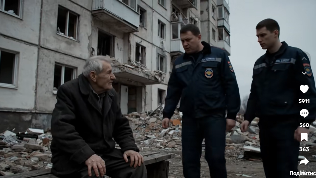 2. Фейк. Інсценований ролик: літній чоловік сидить на тлі зруйнованого багатоквартирного будинку. До нього підходять двоє осіб у формі, схожій на однострої комунальної служби, й вимагають оплату боргу за газ. Сюжет викликає штучне обурення, що свідчить про спробу дискредитації української держави через експлуатацію теми гуманітарної вразливості.