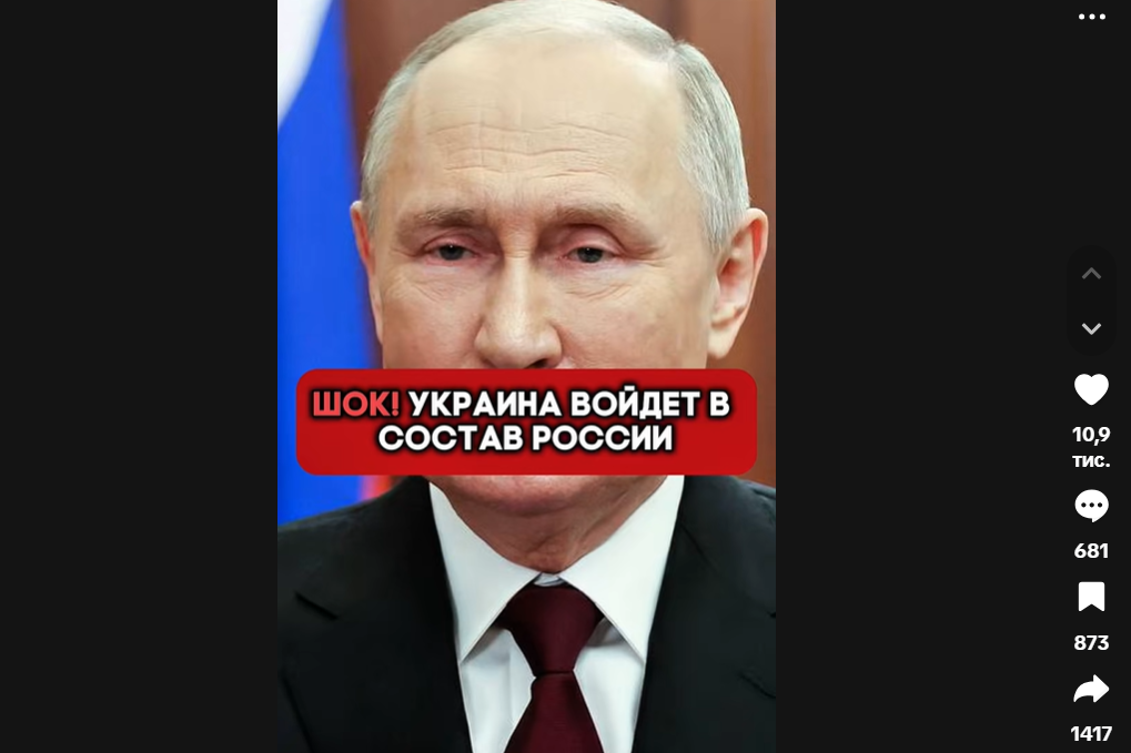 6. Фейк. Відео, зібране з випадкових кадрів за участі Володимира Зеленського та Владіміра Путіна, супроводжується текстом російською мовою про нібито приєднання України до Росії. Автори стверджують, що чинний український президент “продався Заходу”, а тому створено “тимчасову адміністрацію” під керівництвом Путіна. Така конструкція спрямована на підрив легітимності української влади та деморалізацію громадян.