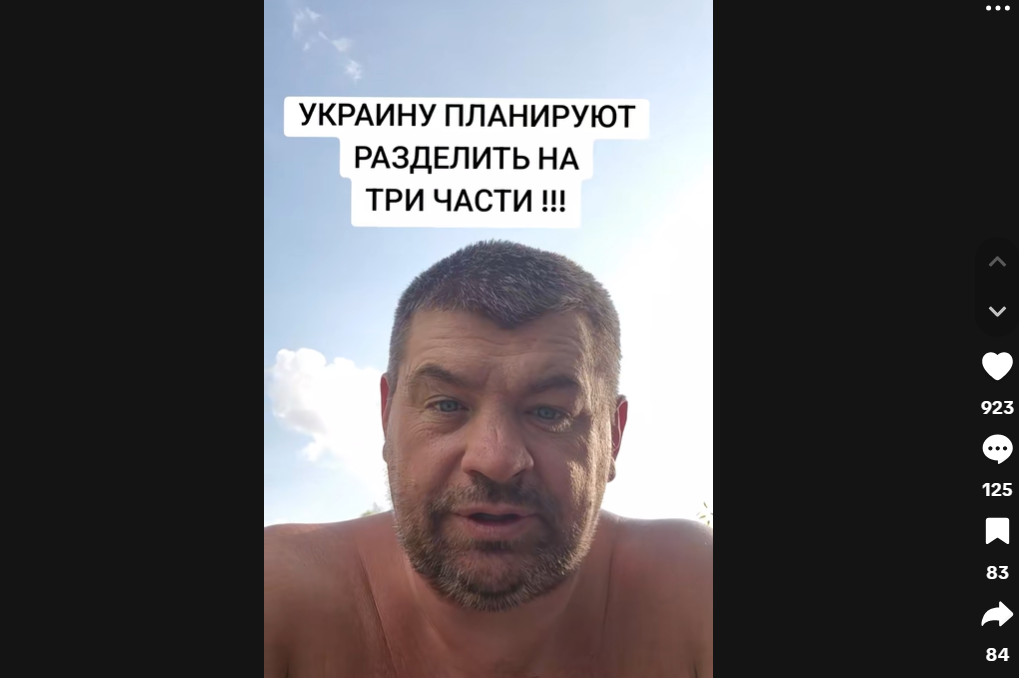 11. Фейк. Відео демонструє TikTok-блогера, який російською мовою переповідає конспірологічну версію “змови” між західними лідерами та керівництвом Росії – нібито з метою поділити Україну на три частини. Таке повідомлення має виразну дезінформаційну природу, спрямовану на підрив довіри як до української влади, так і до партнерських відносин України з демократичними країнами.