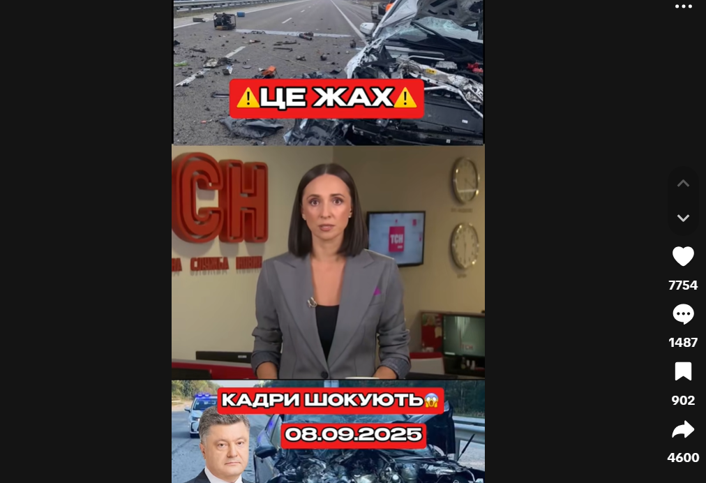 Фейки в TikTok поширюються дещо агресивніше – тут використовуються радикальніші формати, зокрема змонтовані або згенеровані ШІ відео, вирвані з контексту новини, а також конспірологічні теорії про “розподіл України” чи “секретні домовленості Заходу з Путіним”. Серед фейкових відео виявлено значну кількість спроб скомпрометувати українських політиків, військових або волонтерські ініціативи. Технічно фейки реалізовані через псевдоновинні відео, статичні слайд-шоу з провокаційними написами, синтезовані голоси або просто неправдиву інформацію. Частина фейків має на меті спричинити страх і зневіру, наприклад відео про “відсутність світла і тепла”, “загибель Порошенка” або “зраду Зеленського”.