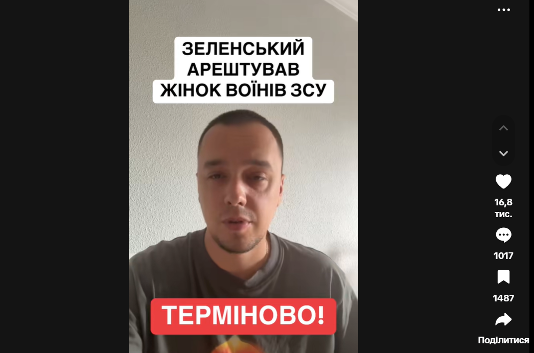20. Фейк. У ролику блогер-пропагандист Мирослав Олешко заявляє, що “Зеленський заарештував жінок воїнів ЗСУ, які влаштували мітинг у Вінниці біля ТЦК”. Насправді президент не має повноважень здійснювати арешти. Факт мітингу дійсно був, однак жінок не затримували – трьом учасницям оголошено підозру в перешкоджанні діяльності Збройних сил. Відео спрямоване на дискредитацію президента Зеленського і підрив довіри до мобілізаційних процесів.