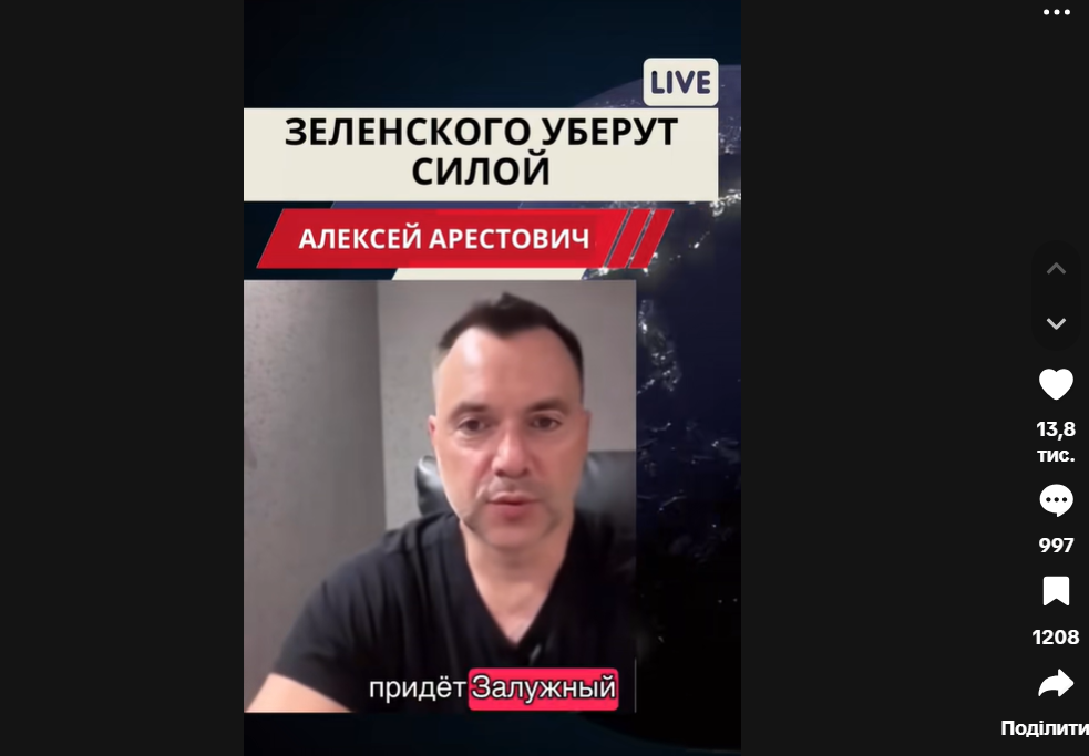 25. Фейк. У відео Олексій Арестович російською мовою стверджує, що, “зокрема в Україні”, нібито обговорюється сценарій насильницького усунення президента Зеленського та заміни його на Валерія Залужного, який начебто “очолить пригнічення громадян військовими”. Відео супроводжується написом: “Зеленского уберут силой”. Такі меседжі дискредитують водночас і Зеленського, і Залужного, сіють паніку та формують образ загрози військового перевороту.