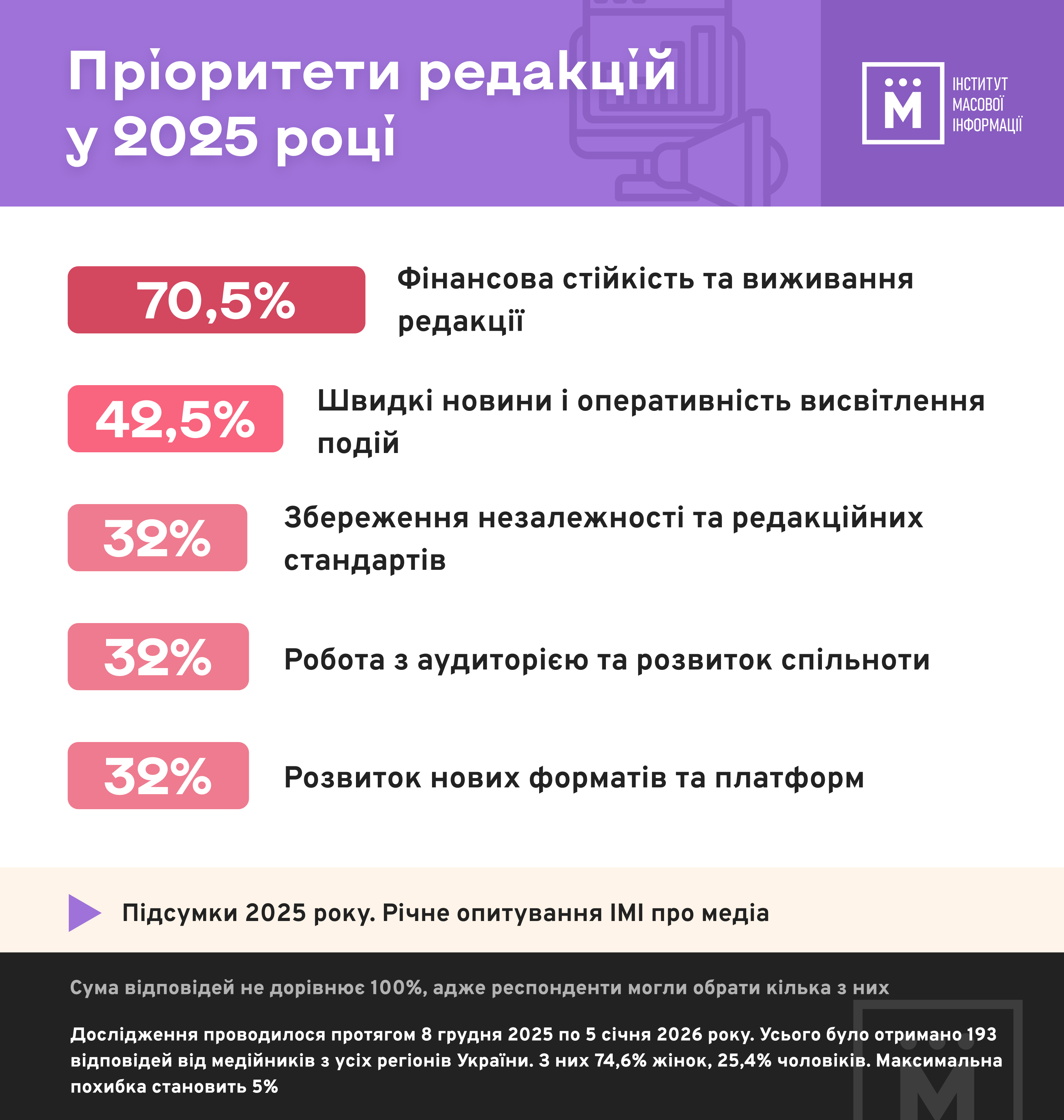 Ключовим пріоритетом для українських медіа у 2025 році стала фінансова стійкість і виживання редакцій. Про це заявили 70,5% опитаних ІМІ журналістів і редакторів. Йшлося насамперед про оптимізацію витрат та пошук нових джерел доходу в умовах скорочення фінансування й загальної економічної нестабільності.