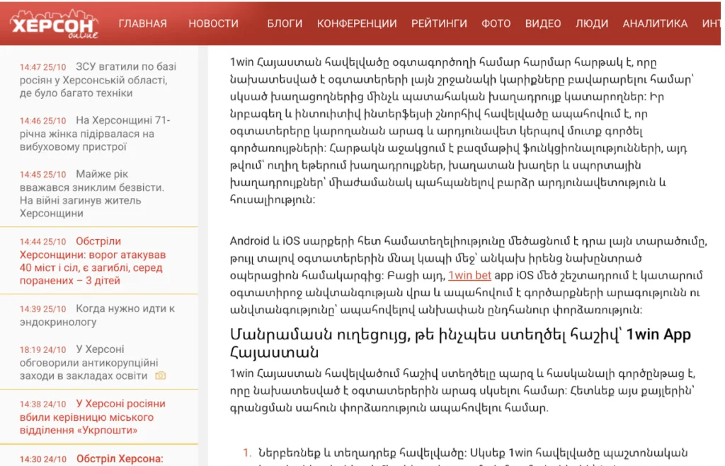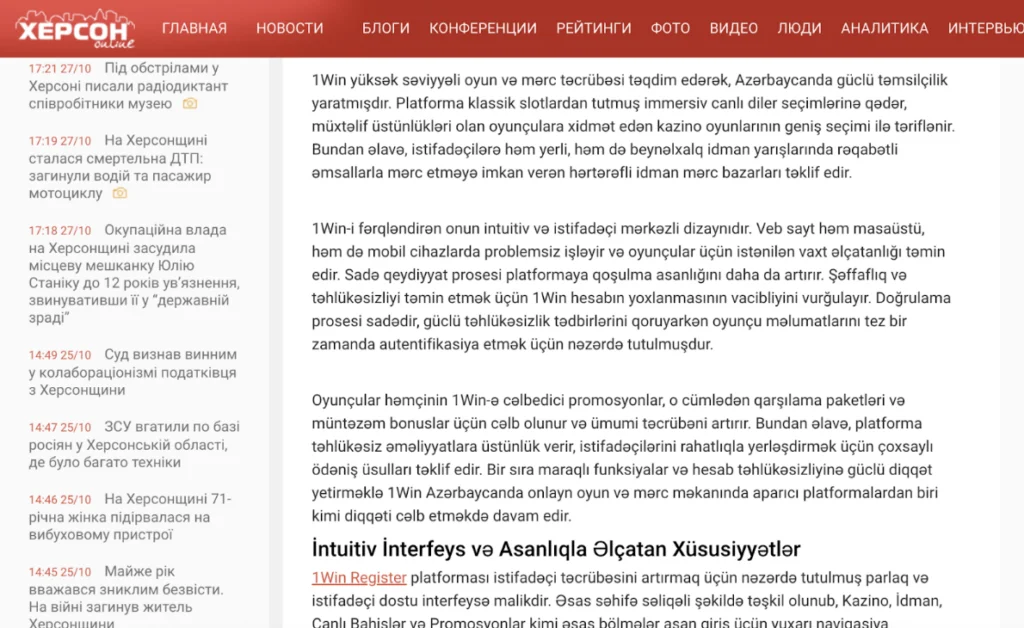 Втім, аналізуючи п’ять місцевих онлайн-медіа, ми виявили два матеріали, розміщені на сайті “Херсон онлайн”, які містять елементи реклами іноземного ігрового майданчика. Обидва написано іноземними мовами – вірменською та азербайджанською. Очевидно, що жодного маркування в статтях немає. Переклад текстів показав, що в обох випадках рекламуються онлайн-казино і в обох матеріалах є посилання на зовнішню платформу, яка працює за межами українського регулювання азартних ігор.