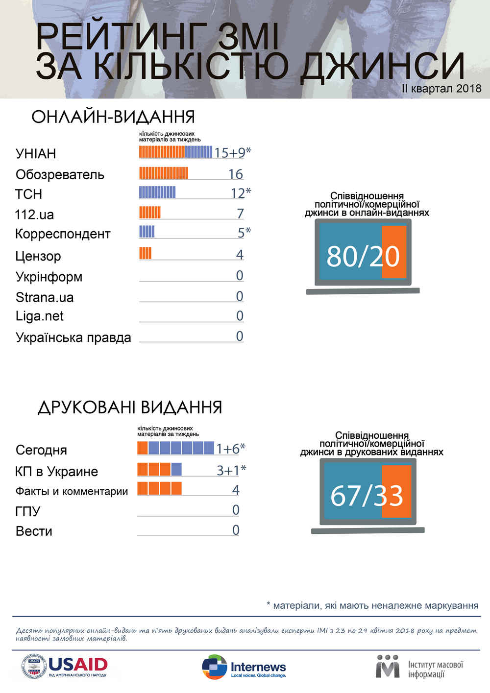 Такими є результати дослідження матеріалів з ознаками замовності (джинси) в десяти популярних українських інтернет-виданнях та в шести загальноукраїнських газетах (УНІАН, «Обозреватель», «Цензор.нет», 112.ua, «Страна.ua», ТСН.ua, «Корреспондент.net», «Українська правда», «Ліга.net», Укрінформ та «Факты и комментарии», «Сегодня», «Вести», «КП в Украине», «Газета по-українськи», «Дзеркало тижня»), що провів ІМІ у квітні 2018 р. за підтримки «Інтерньюз Нетворк»*.