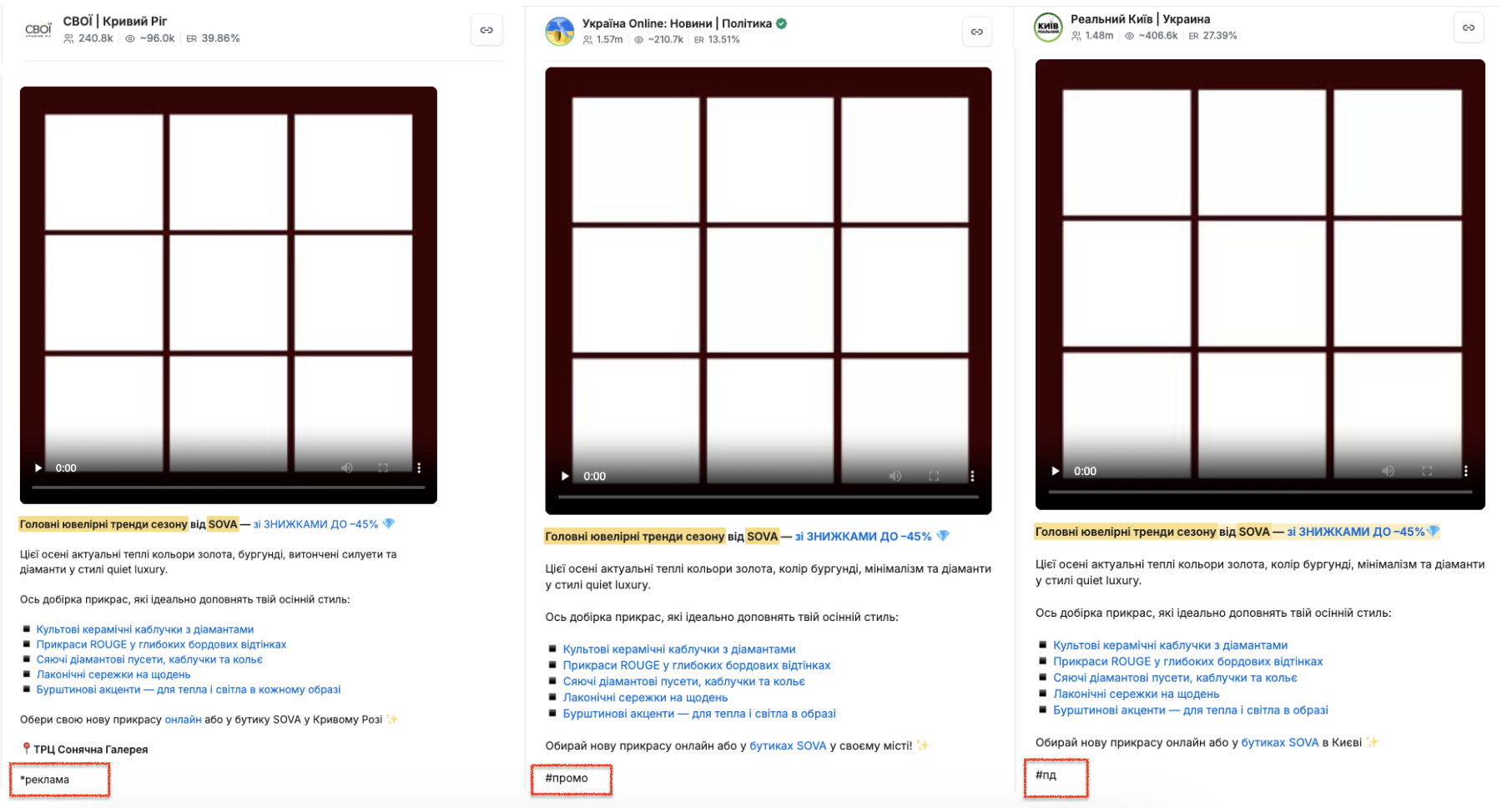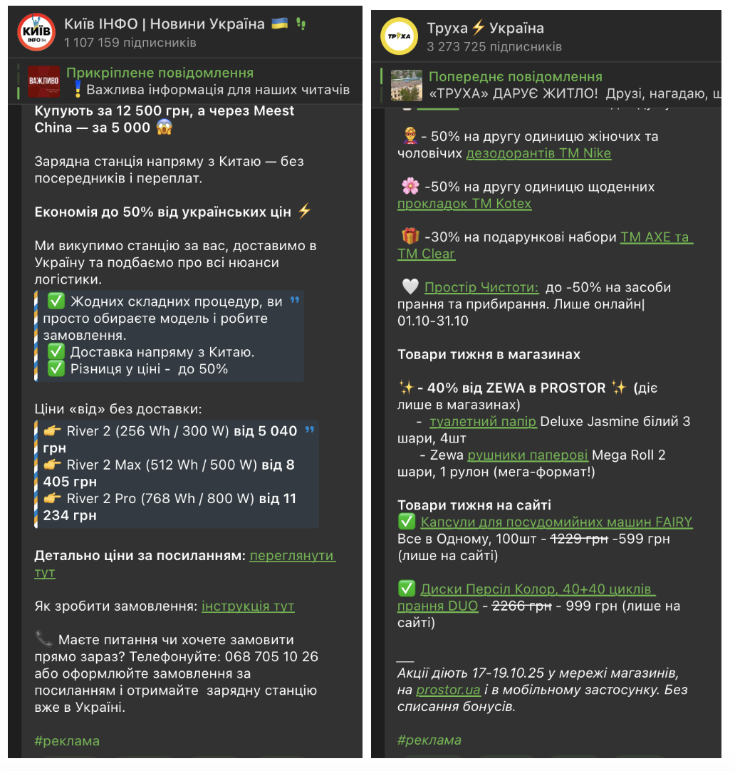 Цікавим є те, що деякі великі за охопленням телеграм-канали все ж таки використовують позначку “реклама” – наприклад, правильне маркування реклами було виявлено на каналах “Труха”, “Київ ІНФО”. Це крок у правильному напрямку, аудиторія чіткіше розуміє, де комерційне повідомлення, а де редакційний контент.