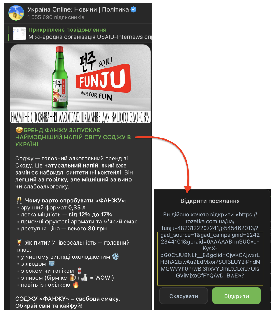 Інший контент, який обов’язково має бути промаркований як реклама, — алкогольні напої. Низка українських телеграм-каналів розмістили рекламу алкогольних напоїв з реферальним посиланням на онлайн-магазин продажу “Розетка”.