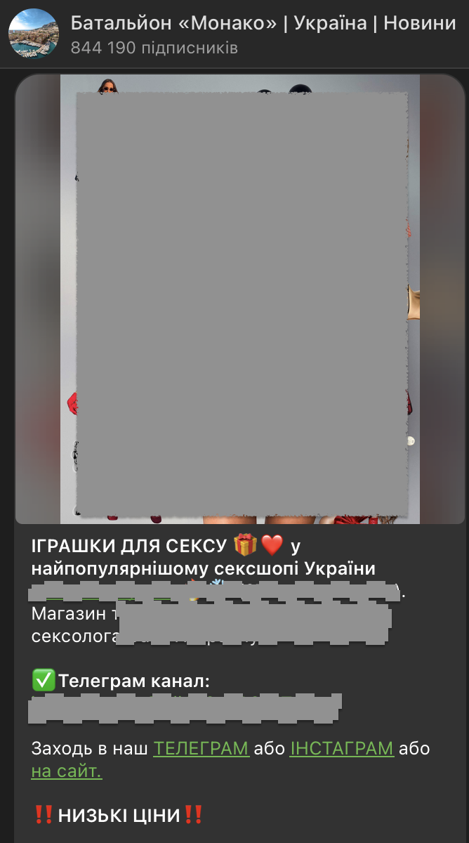 До слова, адміни деяких регіональних каналів “Труха” видаляють такі пости за кілька днів після випуску. Втім, навіть за умови видалення таких рекламних постів з маркуванням “реклама” чи “промо”, ризик випадкового контакту неповнолітніх читачів з такою рекламою залишається. Крім того, варто зважати на відсутність належних механізмів вікового та тематичного таргетингу в більшості великих телеграм-каналів. Реклама з відверто сексуалізованими образами (наприклад, стереотипно одягнена жінка з секс-іграшками) може з’являтися у загальній новинній стрічці користувачів незалежно від їхніх уподобань чи віку. Така подача не відповідає базовим стандартам медійної і рекламної етики (відсутність чіткої аудиторної сегментації, позначення контенту 18+, контексту) і сприяє нормалізації сексизму щодо жінок у новинному середовищі. Це підвищує репутаційні ризики для рекламодавців і загалом погіршує якість інформаційного простору.