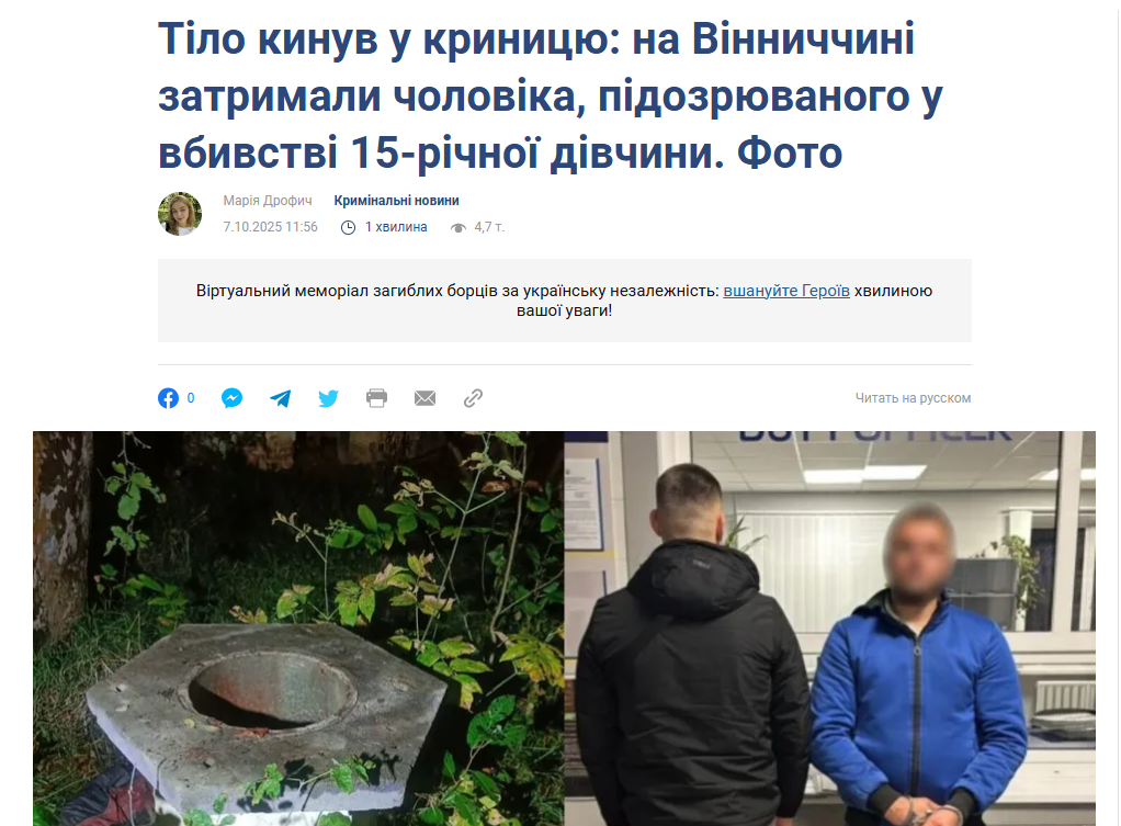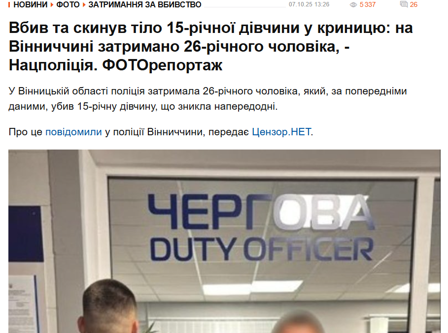 - Вбив та скинув тіло 15-річної дівчини у криницю: на Вінниччині затримано 26-річного чоловіка, – Нацполіція (Цензор)
