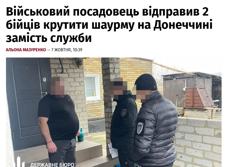 - Військовий посадовець відправив 2 бійців крутити шаурму на Донеччині замість служби (Українська правда)