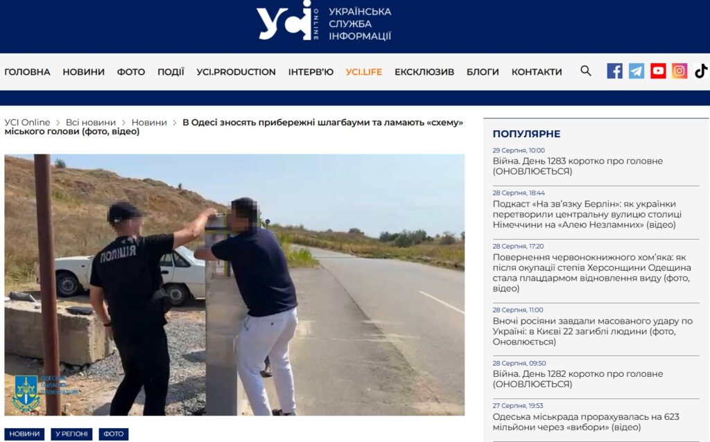 У темі демонтажу шлагбаумів УСІ поширили сюжет з виразним політичним відтінком “В Одесі зносять прибережні шлагбауми та ламають “схему” міського голови”.