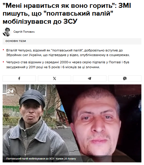 - “Мені нравиться як воно горить”: ЗМІ пишуть, що “полтавський палій” мобілізувався до ЗСУ (24 канал)