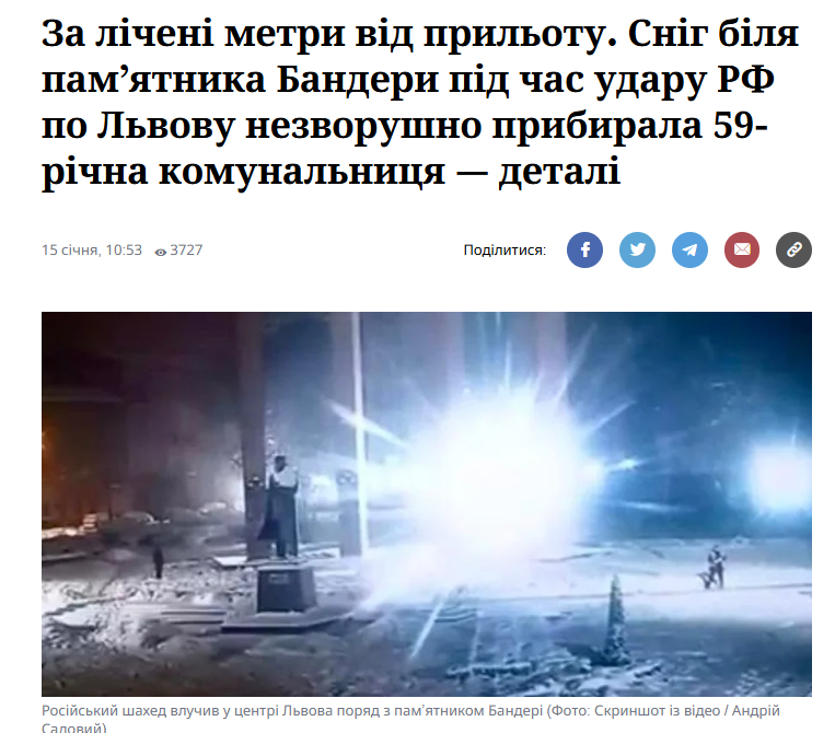 - За лічені метри від прильоту. Сніг біля пам’ятника Бандери під час удару РФ по Львову незворушно прибирала 59-річна комунальниця – деталі (NV)