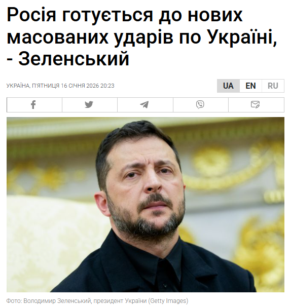 *Моніторинг проводився серед 10 онлайн-медіа України, що, за даними Similarweb, мають найбільше заходів користувачів: OBOZ.UA, Цензор.Нет, ТСН, РБК-Україна, “Українська правда”, 24 канал, УНІАН, NV, Кореспондент.net, “Фокус”. За допомогою моніторингового робота ІМІ з рубрики новин кожного витягнуто новини, що безпосередньо стосуються війни Росії проти України, опубліковані протягом 15 та 16 січня 2026 року.