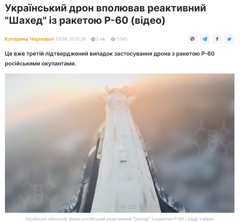 - Український дрон вполював реактивний “Шахед” із ракетою Р-60 (відео) (УНІАН)