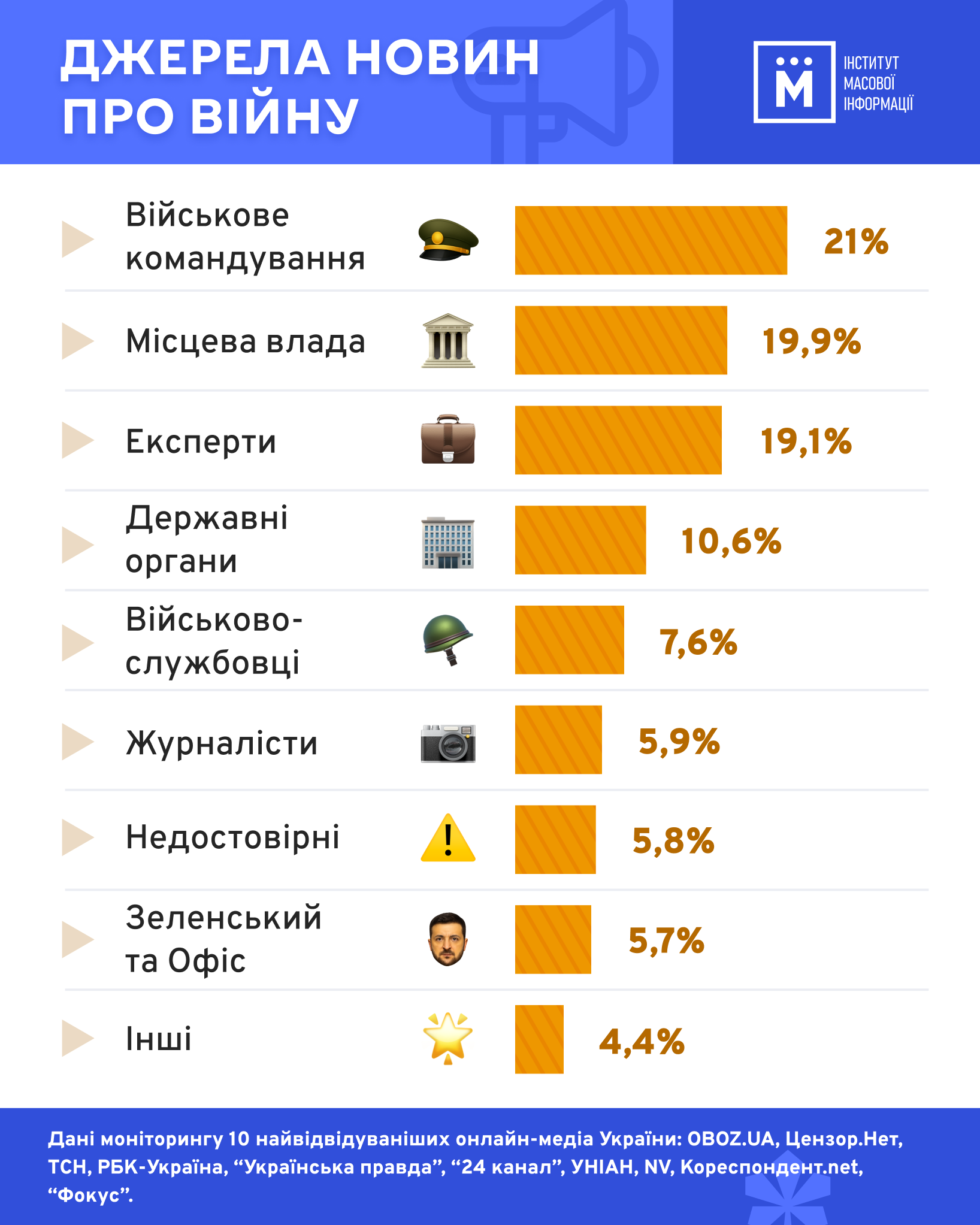 Експерти ІМІ дослідили, на які джерела посилаються в матеріалах про війну 10 найвідвідуваніших онлайн-медіа України. У межах моніторингу джерела інформації були згруповані в категорії. З того, яку частку із загальної кількості досліджених метаріалів становить кожна з категорій, можна зробити висновок про те, хто фактично формує щоденну картину війни для аудиторії.