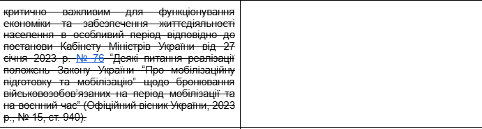 - В абзаці 20-му слова “У разі перебування у трудових відносинах також надається рішення про визначення підприємства, установи, організації критично важливим для функціонування економіки та забезпечення життєдіяльності населення в особливий період або критично важливим для забезпечення потреб Збройних Сил, інших військових формувань в особливий період, завірене належним чином” вилучити.