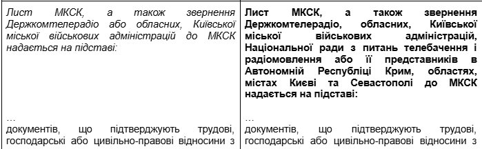 - Абзац 13-й викласти в такій редакції: “Лист МКСК, а також звернення Держкомтелерадіо, обласних, Київської міської військових адміністрацій, Національної ради з питань телебачення і радіомовлення або її представників в Автономній Республіці Крим, областях, містах Києві та Севастополі до МКСК надається на підставі”.