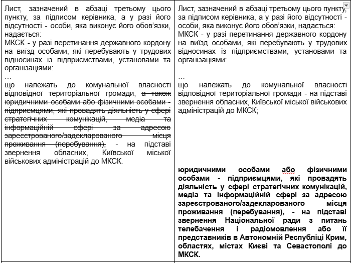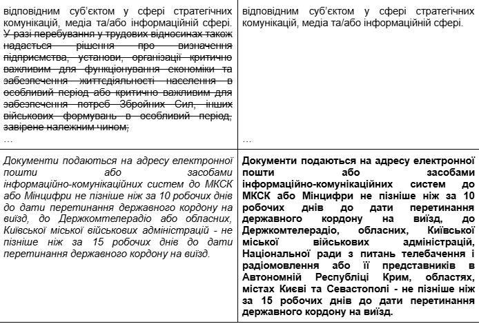 - Абзац 25-й викласти в такій редакції: “Документи подаються на адресу електронної пошти або засобами інформаційно-комунікаційних систем до МКСК або Мінцифри не пізніше ніж за 10 робочих днів до дати перетинання державного кордону на виїзд, до Держкомтелерадіо, обласних, Київської міської військових адміністрацій, Національної ради з питань телебачення і радіомовлення або її представників в Автономній Республіці Крим, областях, містах Києві та Севастополі – не пізніше ніж за 15 робочих днів до дати перетинання державного кордону на виїзд”.