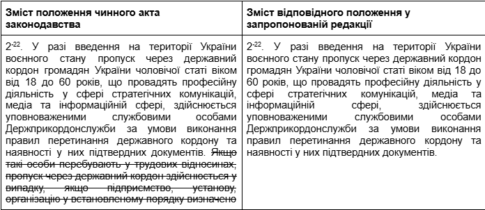 У разі введення на території України воєнного стану пропуск через державний кордон громадян України чоловічої статі віком від 18 до 60 років, що провадять професійну діяльність у сфері стратегічних комунікацій, медіа та інформаційній сфері, здійснюється уповноваженими службовими особами Держприкордонслужби за умови виконання правил перетинання державного кордону та наявності в них підтвердних документів. Якщо такі особи перебувають у трудових відносинах, пропуск через державний кордон здійснюється в разі, якщо підприємство, установу, організацію у встановленому порядку визначено критично важливими для функціонування економіки та забезпечення життєдіяльності населення в особливий період відповідно до постанови Кабінету Міністрів від 27 січня 2023 року № 76 “Деякі питання реалізації положень Закону України “Про мобілізаційну підготовку та мобілізацію” щодо бронювання військовозобов’язаних на період мобілізації та на воєнний час” (“Офіційний вісник України”, 2023 р., № 15, ст. 940).