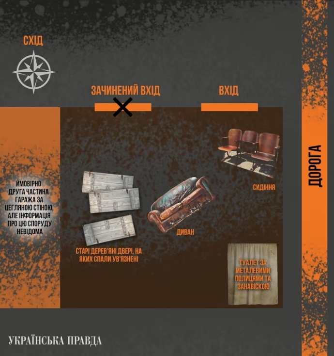 “Інші в’язні помогли мені відмитися від крові. Виявилося, що тут були люди, які сиділи понад 20 діб. Гараж був не маленький: 10 на 5 метрів, збудований з каменю. Було двоє залізних воріт, у кутку за целофановою завісою – відро-туалет. Під стіною – крісла з відкидними сидіннями. На полу лежало три-чотири штуки старих дерев’яних дверей зі старими ковдрами. По центру – старий диван. На них ми спали”, – описує свою “камеру” Віталій.