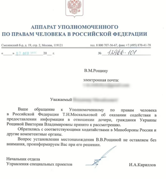 “Вопрос установления местонахождения В. В. Рощиной не оставляем без внимания, проинформируем о его решении”, – йдеться в документі.