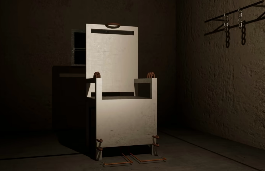 Електричний стілець з обмежувачами. Через тортури електрострумом проходила велика кількість українських полонених