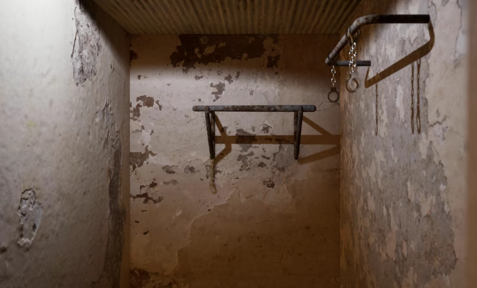 Кімната з решітками, на яких затриманих у наручниках підвішували догори ногами в перевернутому положенні ембріона на 10–15 хвилин, водночас їх били або катували струмом