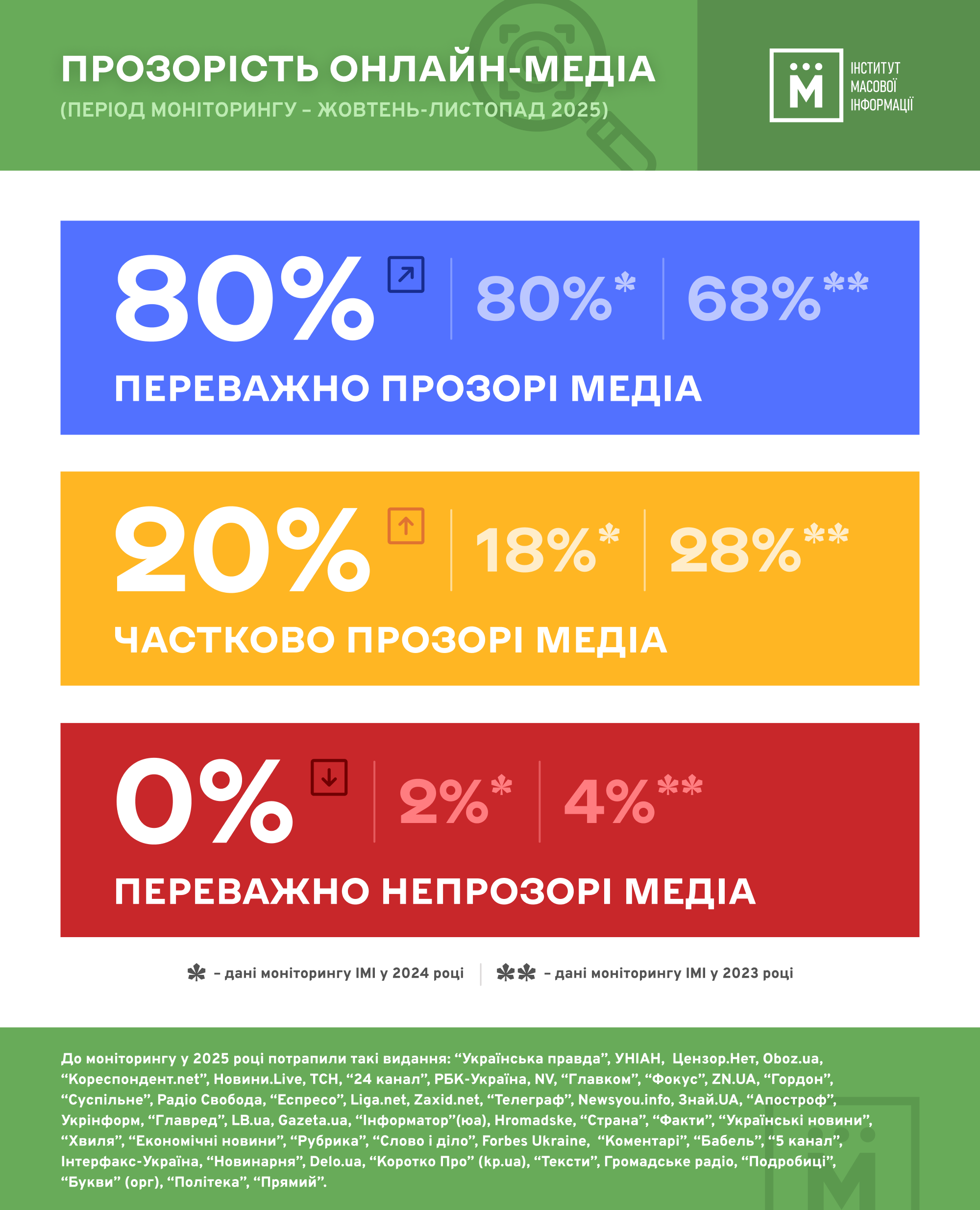 Протягом 2025 року прозорість провідних онлайн-медіа України перебуває на рівні 80% (у 2024-му – 80%, у 2023-му – 68%). Попри збереження тогорічного рівня прозорості, вперше за час весь час моніторингу не виявлено переважно непрозорих медіа (медіа з низьким рівнем прозорості).