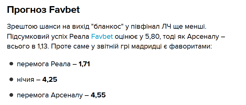 Невиділені рекламні блоки. У публікації “Реал мріє про диво в Лізі чемпіонів: які шанси у команди Луніна на камбек проти Арсеналу“ (“24 канал”) частину тексту оформлено як блок із прогнозами Favbet: перелік коефіцієнтів, ймовірність забитих голів, згадки гравців. Це типовий приклад продакт-плейсменту в спортивній публіцистиці без розкриття рекламного характеру контенту.