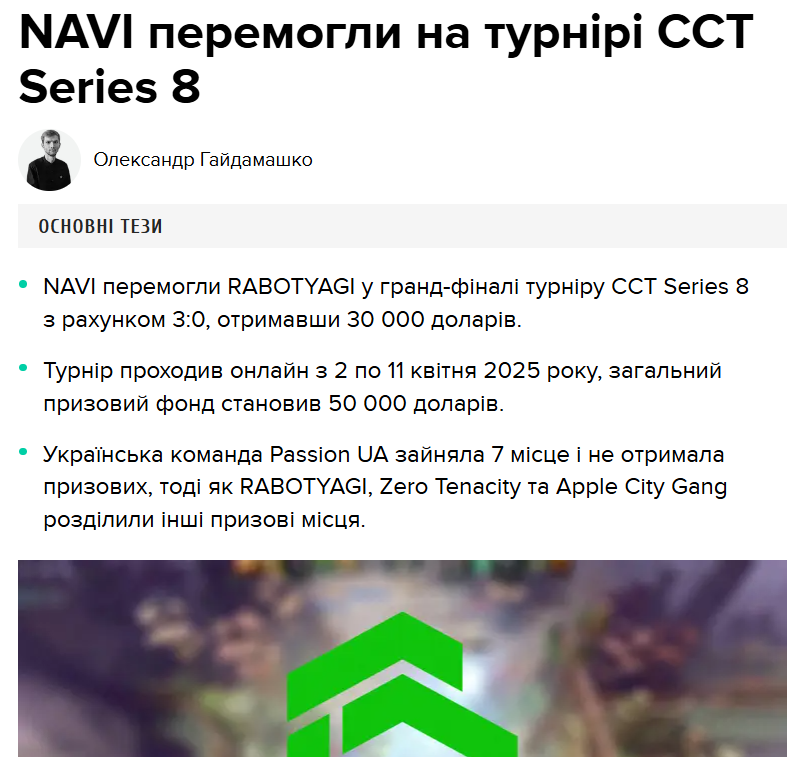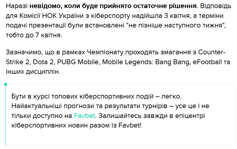 Кіберспорт. У публікаціях про кіберзмагання реклама інтегрується через згадки про платформу ставок. Наприклад, у тексті “NAVI перемогли на турнірі CCT Series 8” (“24 канал”) завершення публікації містить пряму рекламу Favbet із закликом підписатися на платформу. Такий текст імітує редакційний стиль, але фактично є комерційною вставкою. На тому ж сайті в публікації “Natus Vincere ще більше впали у світовому рейтингу HLTV” останній абзац знову рекламує Favbet, маскуючи просування ставок під кіберспортивну аналітику.