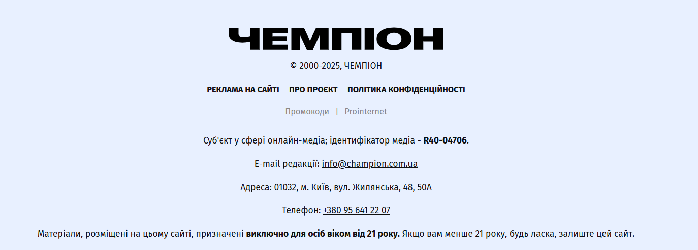 Лише на сайті “Чемпіон” до матеріалів, що просувають бренди, пов’язані з ігровим бізнесом, іноді додають виноску “Рекламна інформація”, розміщену внизу тексту. “Чемпіон” розміщує і ліцензійну інформацію з додаванням стандартного попередження про небезпеку азартних ігор.