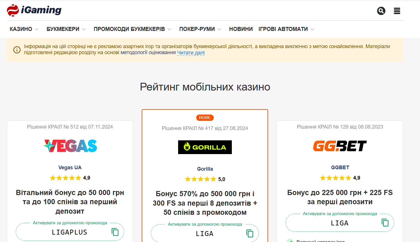На спеціалізованих сторінках, як-от в OBOZ.UA (“Фріспіни за реєстрацію – Безкоштовні фріспіни без депозиту“) чи в ЛІГА.net (“Liga iGaming – Все про онлайн-казино України”), можуть міститись окремі згадки про відповідальну гру, однак це не компенсує відсутності маркування реклами й вікових обмежень. Тобто вжиті формальності не дають читачеві повного розуміння, що перед ним – рекламний контент про азартні ігри.