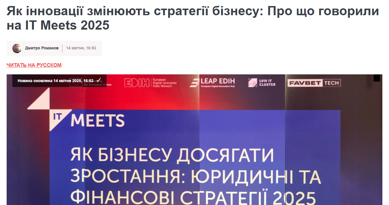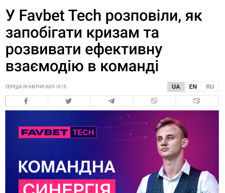 Бізнес і технології. У матеріалі “Як інновації змінюють стратегії бізнесу: Про що говорили на IT Meets 2025” (“Телеграф”) компанія Favbet Tech згадується як один з лідерів ринку. Аналогічно в публікації “У Favbet Tech розповіли, як запобігати кризам та розвивати ефективну взаємодію в команді” (РБК-Україна) та в матеріалі “Командна синергія в проєктному менеджменті: досвід Favbet Tech” (“Телеграф”) героєм стає керівник ІТ-компанії, афілійованої з букмекерським брендом.