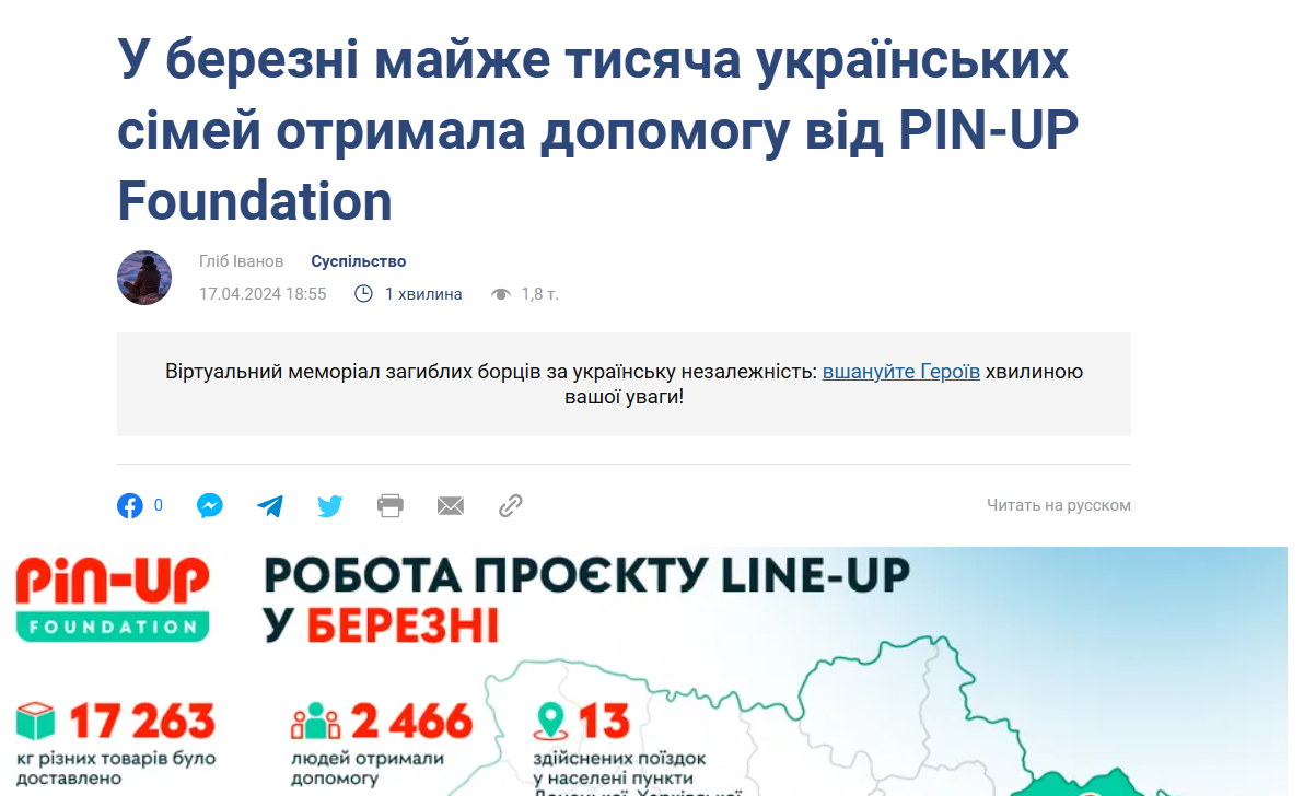 Благодійність. На сайті OBOZ.UA вийшла публікація “У березні майже тисяча українських сімей отримала допомогу від PIN-UP Foundation”. Усі згадки про бренд позитивні, вони подаються у форматі інформаційного повідомлення, але без жодного зазначення про зв’язок з азартними іграми. Водночас PIN-UP Foundation прямо пов’язаний з ігровим бізнесом. У публікації немає маркування, попереджень чи пояснень, що робить її типовим прикладом прихованої іміджевої реклами.