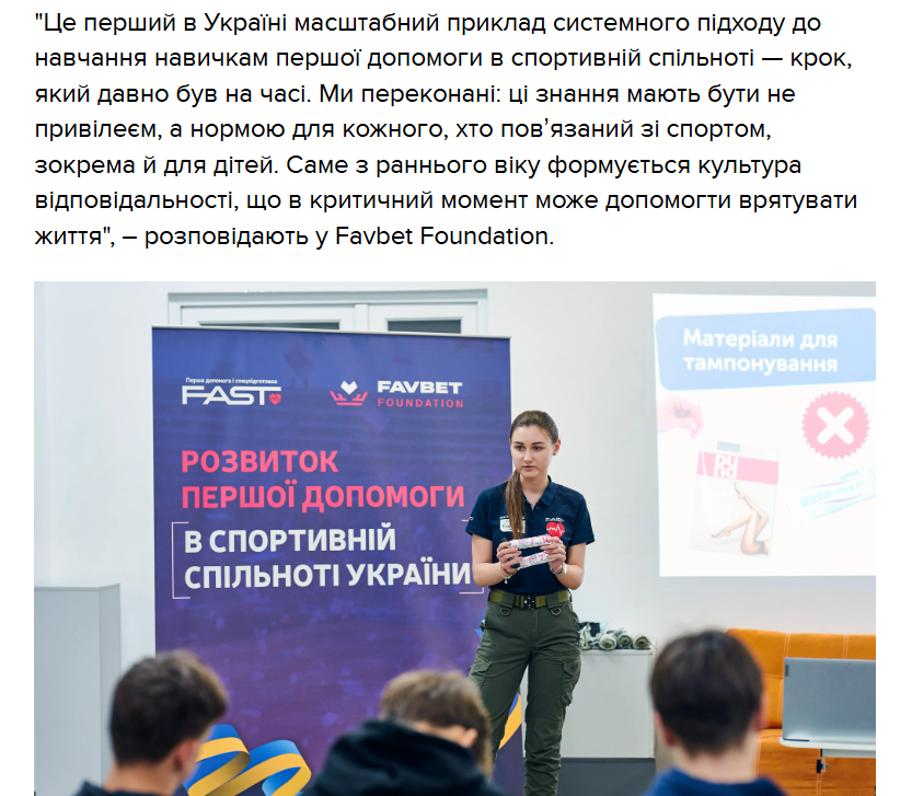 Соціальна реклама через партнерські згадки. У публікації “Знати, щоб допомогти: тренінг з домедичної допомоги від FAST за підтримки Favbet Foundation“ (“24 канал”) бренд, пов’язаний з ігровим бізнесом, згадується понад п’ять разів, акцентується на його ролі як організатора заходу.